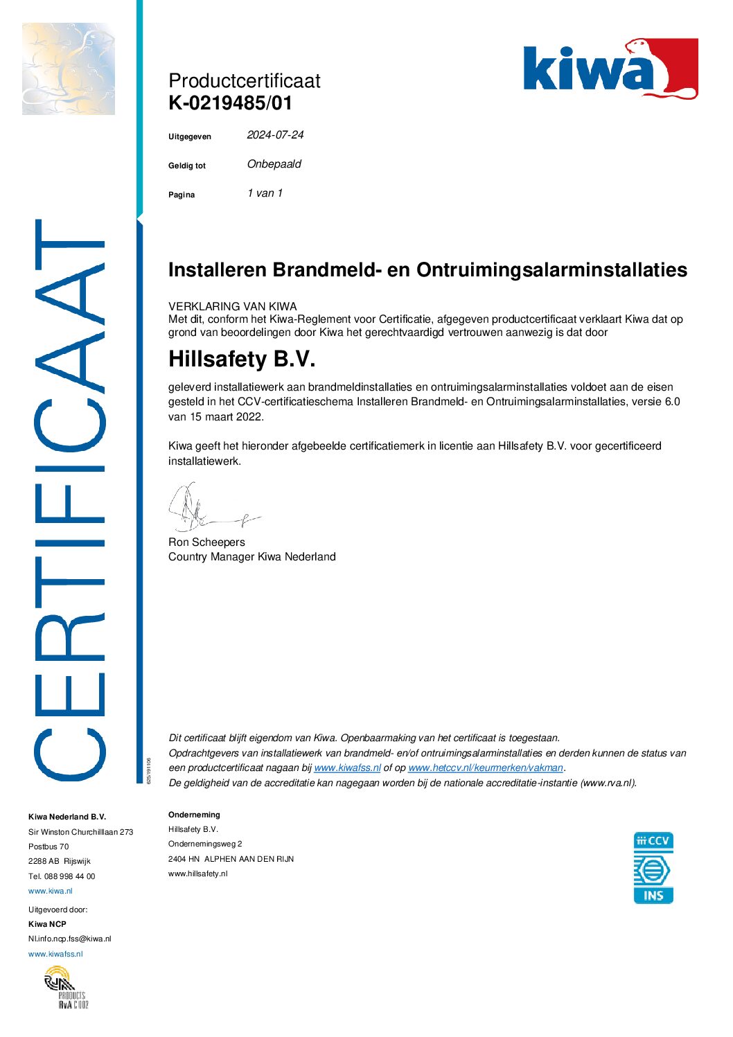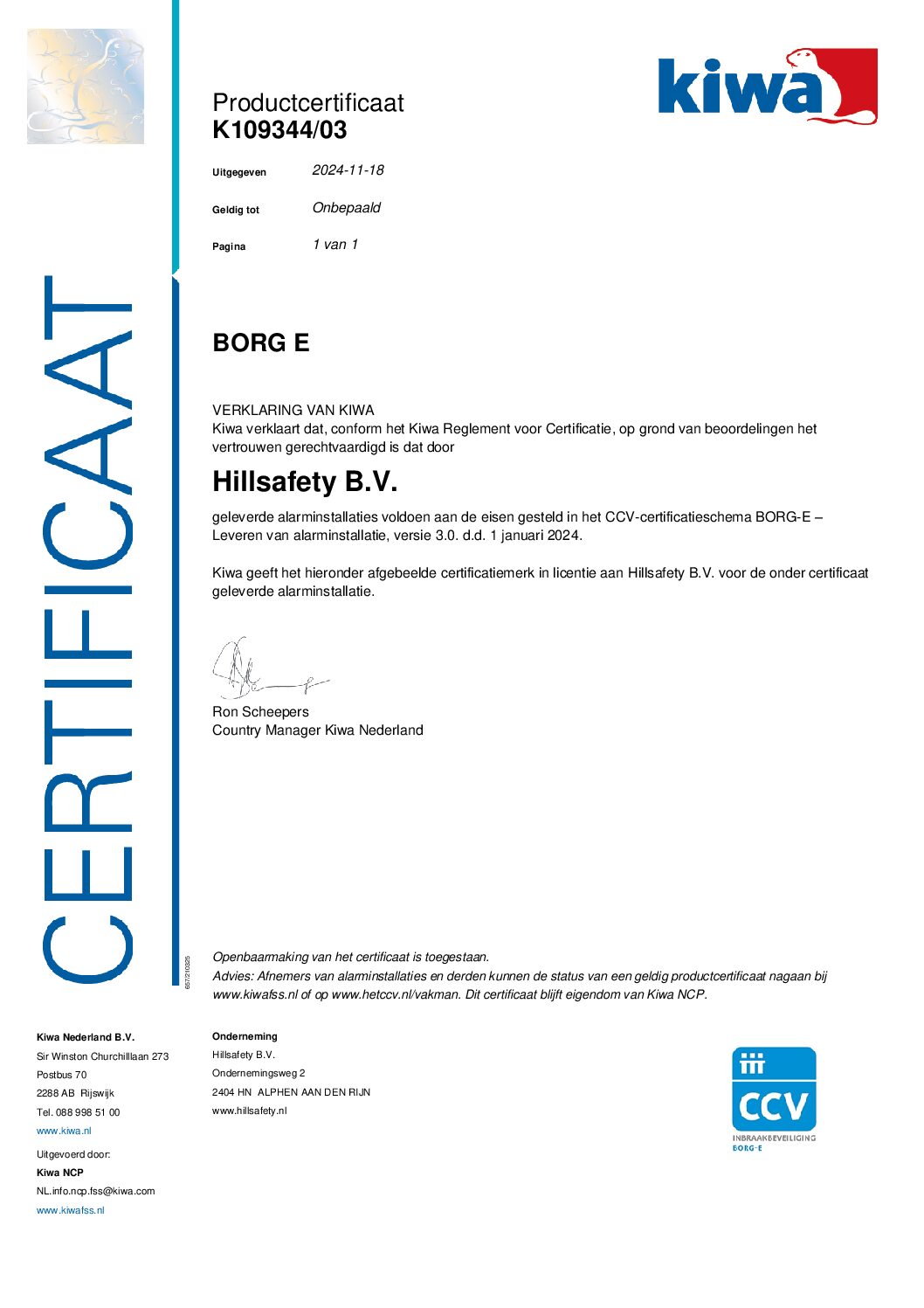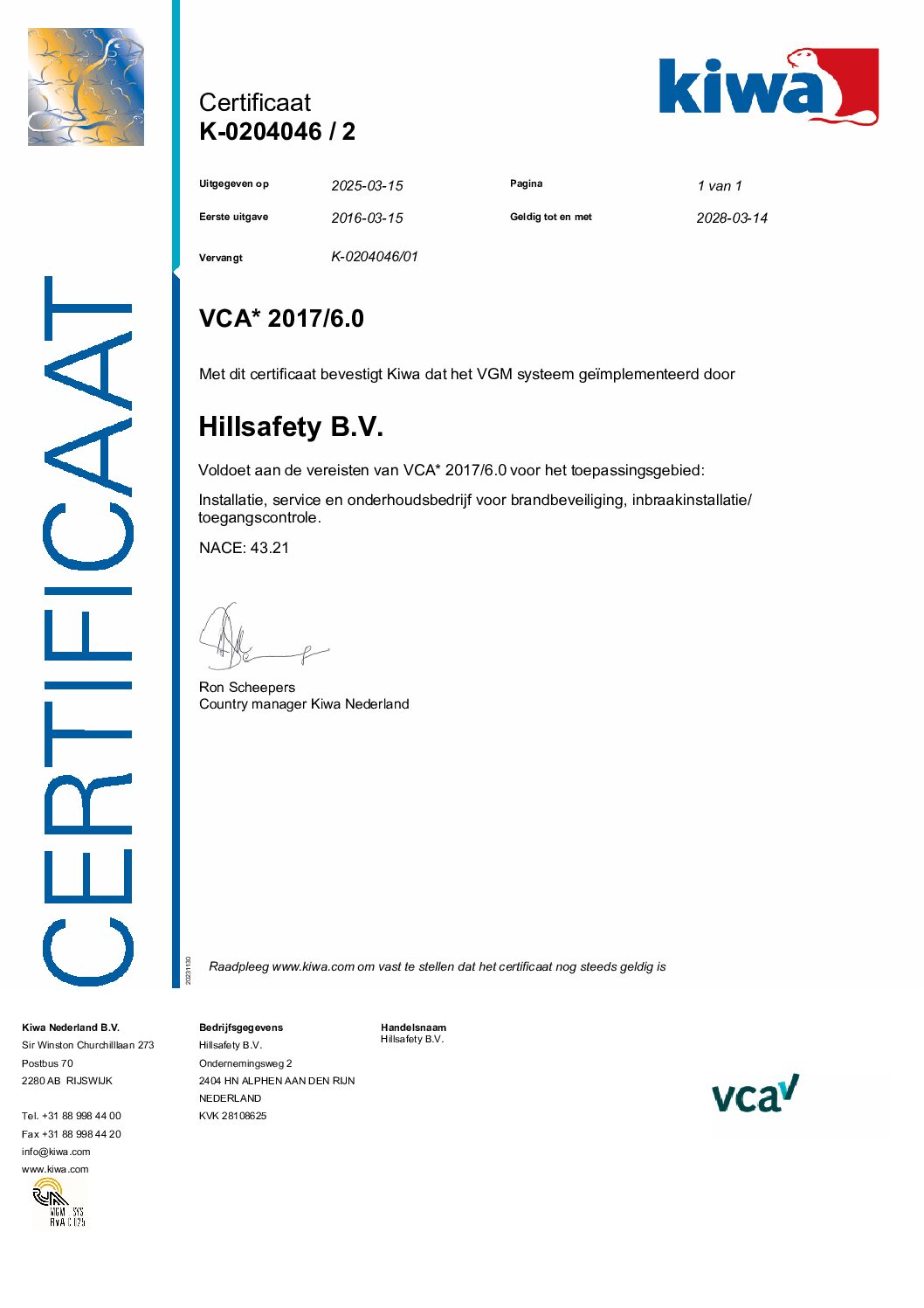 Hillsafety B.V. is gecertificeerd door Kiwa FSS Certification en voldoet aan alle eisen voor de volgende keurmerken: